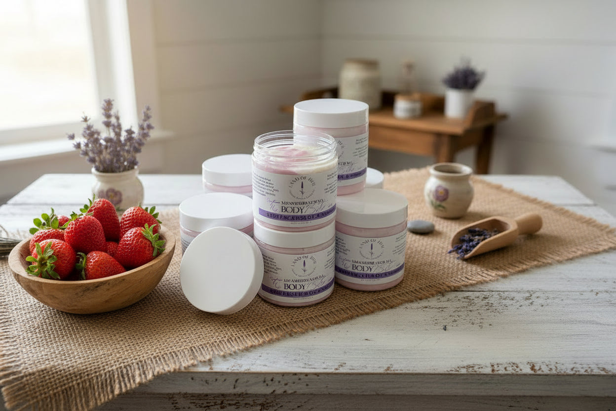 Our reformulated body butter blends natural strawberry fragrance oil with vanilla in a captivating pink and white ombre design. The luxurious formula features sparkling mica that adds a delightful shimmer that children love. This 8oz jar delivers effective moisturization while appealing to young ones with its sweet scent and enchanting appearance.